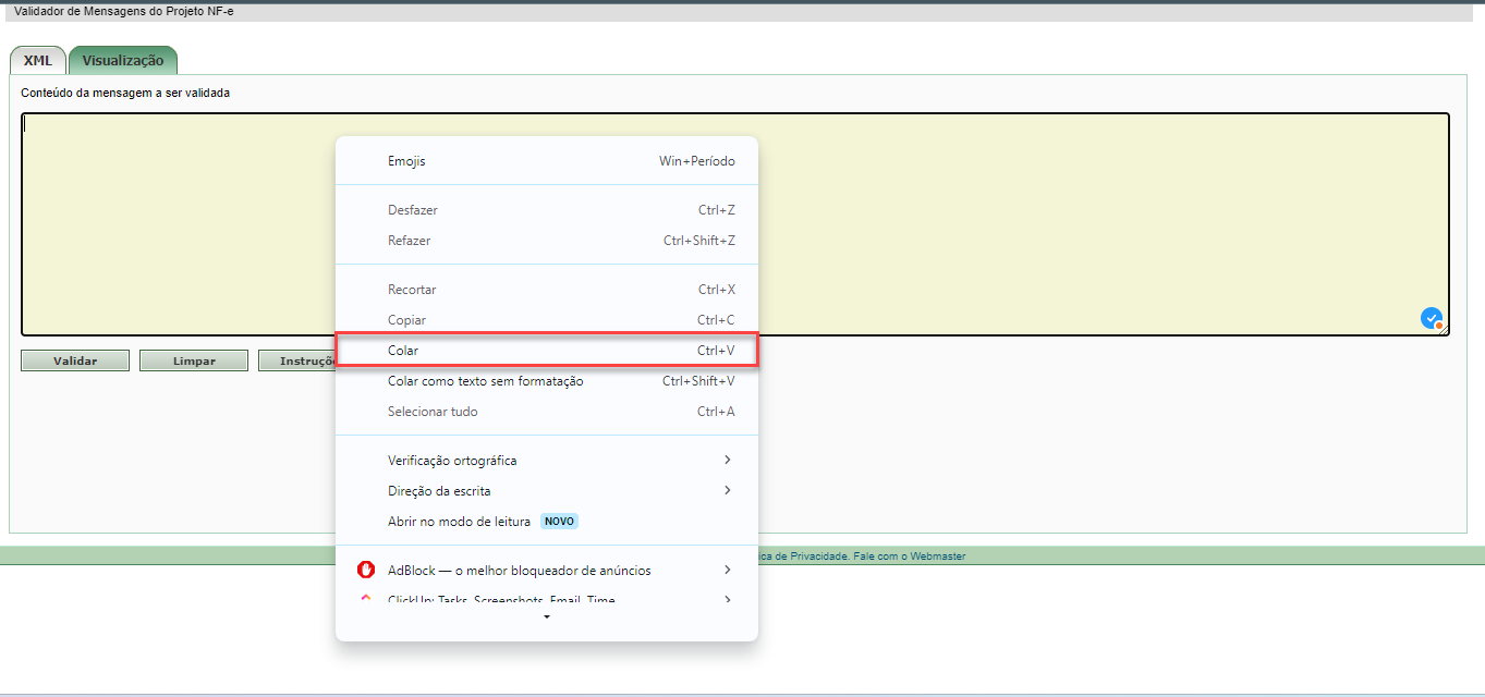 6) Acesse o validador de XML da SEFAZ clicando aqui. Clique com o botão direito dentro do campo livre “Conteúdo da mensagem a ser validada” e escolha a opção “Colar”.