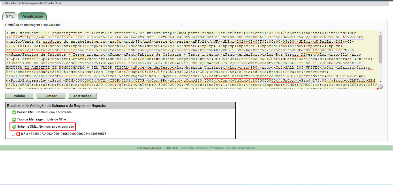 8) Se houver erro na estrutura, o validador exibirá o diagnóstico na seção “Schema XML”.