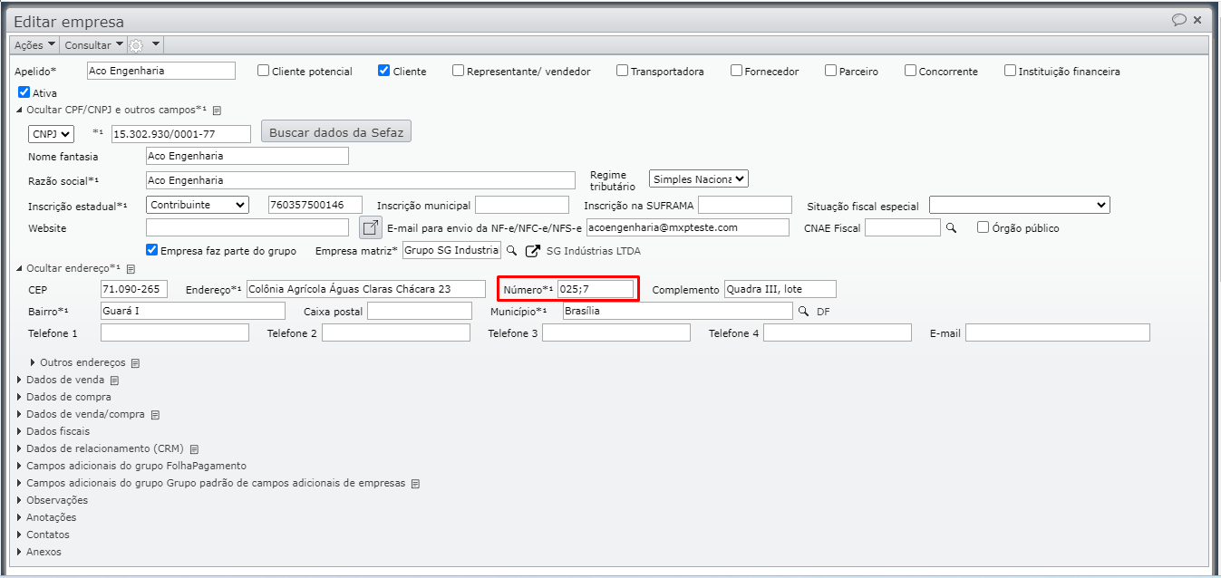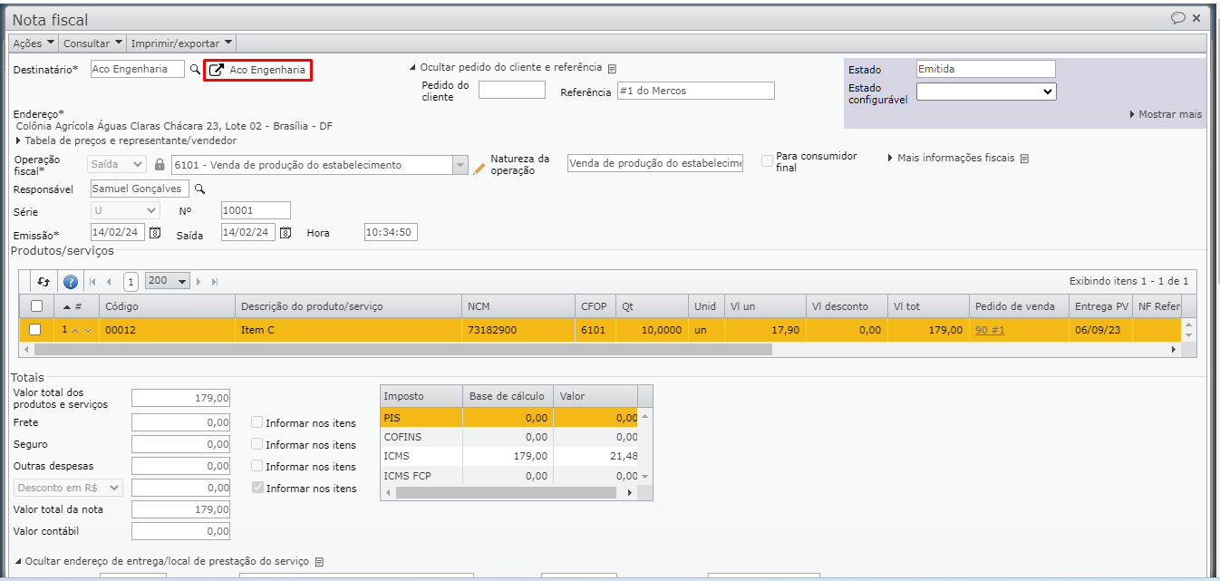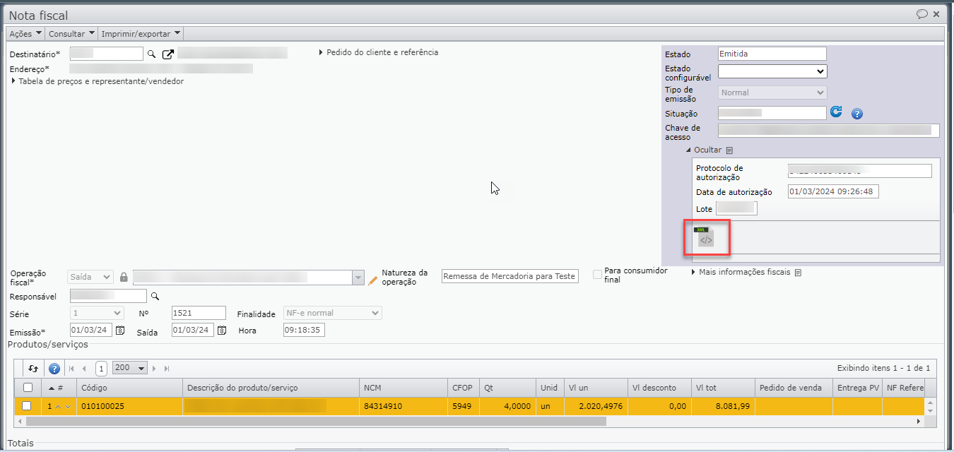 9) Se o erro não foi identificado pelo validador, verifique os campos do cadastro da empresa destinatária ou remetente da nota fiscal no sistema, para confirmar se não há algum campo preenchido indevidamente. Para isso, por meio da nota fiscal, clique no ícone de redirecionamento ao lado do campo com o “Apelido” da empresa.