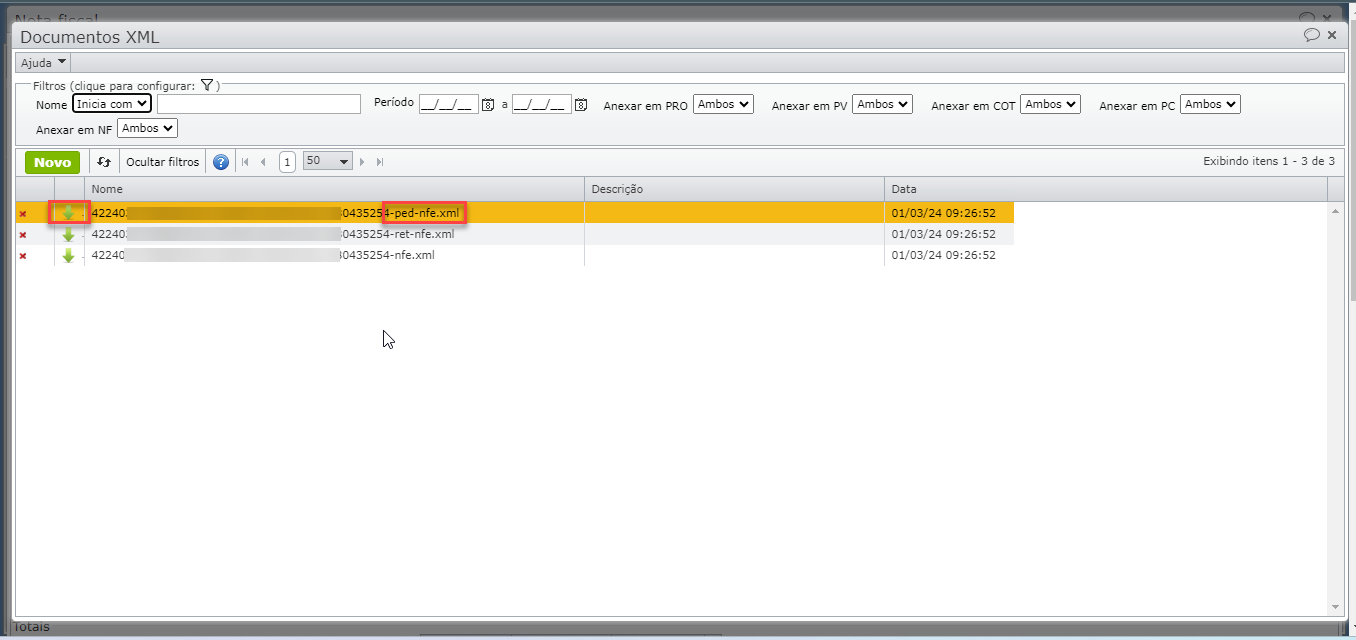 3) Na pasta de XMLs, localize o XML “ped” e clique na flecha verde para baixar.