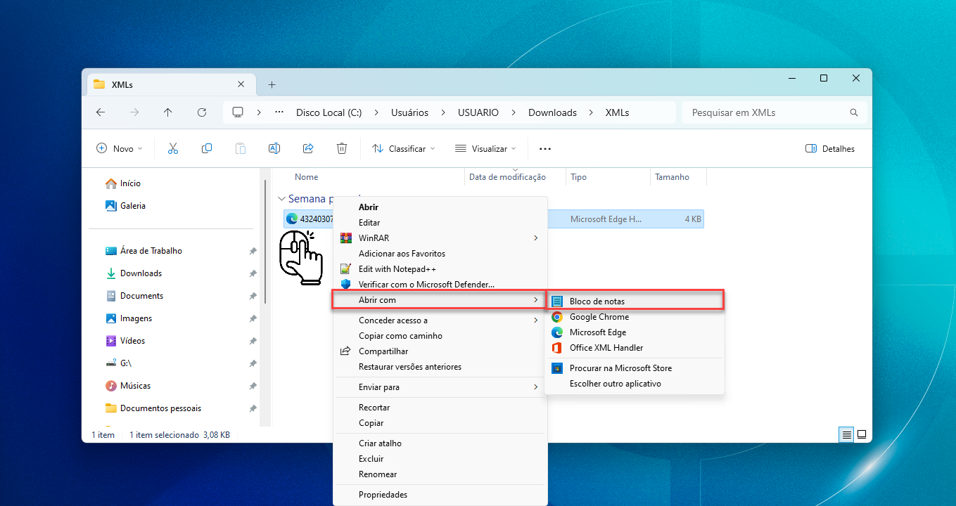 4) Após o download do arquivo XML, abra sua tela de edição por meio do bloco de notas. Selecione o arquivo, clique com o botão direito do mouse, e escolha a opção “Abrir com > Bloco de notas”.