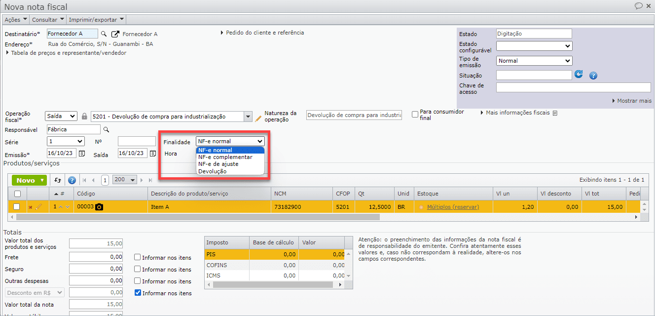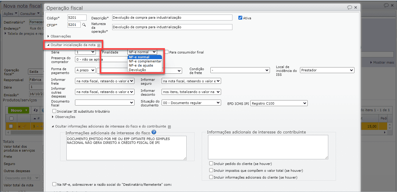 Obs.: O campo “Finalidade” é inicializado nos documentos fiscais conforme definido na operação fiscal. Portanto, se necessário, acerte a finalidade diretamente no cadastro da operação fiscal, seção “Inicialização da nota”.