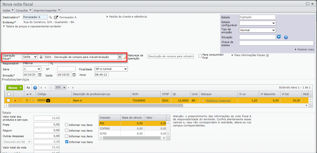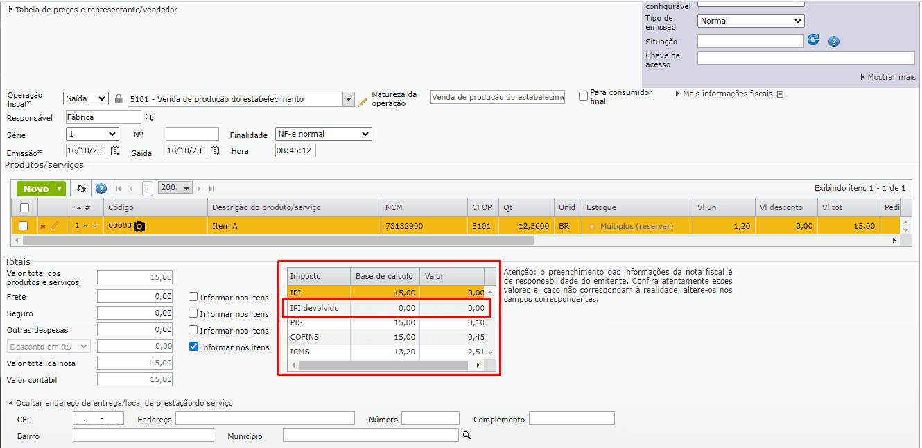 3) Se a NF-e não for de devolução, e a operação fiscal informada estiver correta, verifique os impostos que estão sendo informados na NF-e. Neste caso, não deve haver grupo de impostos devolvidos, como “IPI devolvido”, “PIS devolvido”, “COFINS devolvido”, etc.