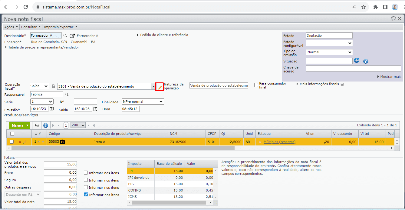 a) Para remover o imposto da NF-e, primeiro deve remover da operação fiscal. Portanto, clique no ícone do lápis ao lado direito do campo “Operação fiscal” ou acesse “Fiscal > Cadastros > Operações fiscais”.