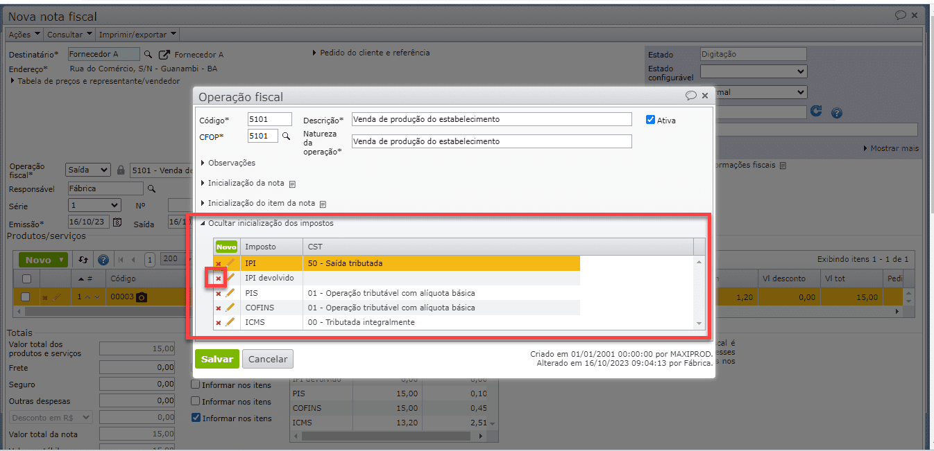 b) Na edição da operação fiscal, expanda a seção “Inicialização dos impostos”, e exclua o imposto que não deve constar na NF-e. Para excluir clique no ícone do “x vermelhinho” ao lado esquerdo da linha do imposto.