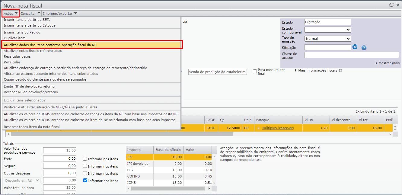 c) Após remover o imposto da operação fiscal, acesse a edição da NF-e, navegue até o menu “Ações” e clique na opção “Atualizar dados dos itens conforme operação fiscal da NF”. Com isso, os impostos dos itens da nota serão atualizados.