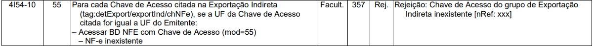 A Rejeição “357 – Chave de Acesso do grupo de Exportação Indireta inexistente”, indica que a chave informada no campo refNFe (do grupo exportInd) não foi localizada no sistema ou está incorreta. Esta rejeição exige uma verificação da chave de acesso referenciada, garantindo que seja válida, regularmente emitida e vinculada à operação de exportação indireta em questão.