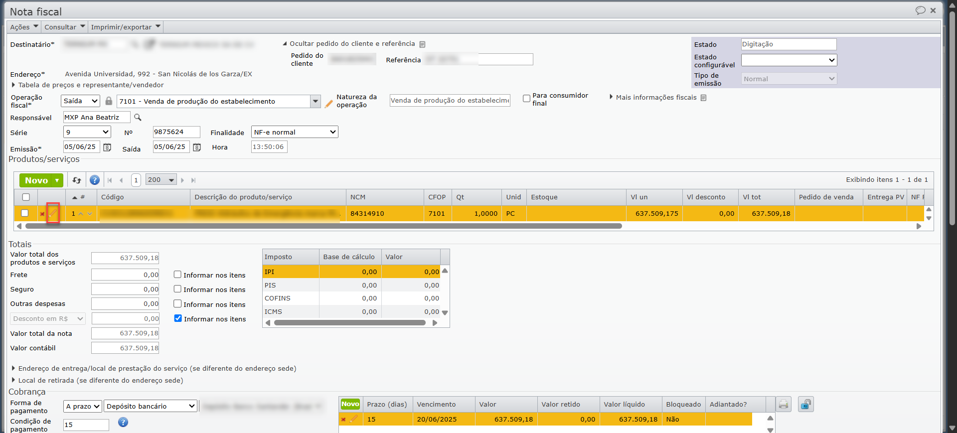 3) Na tela de edição da NF-e, após desfazer a emissão da NF, abra a tela de edição do item da NF que apresenta a divergência. Para isso, clique no ícone do lápis deste item na grade de “Produtos e serviços” da NF.