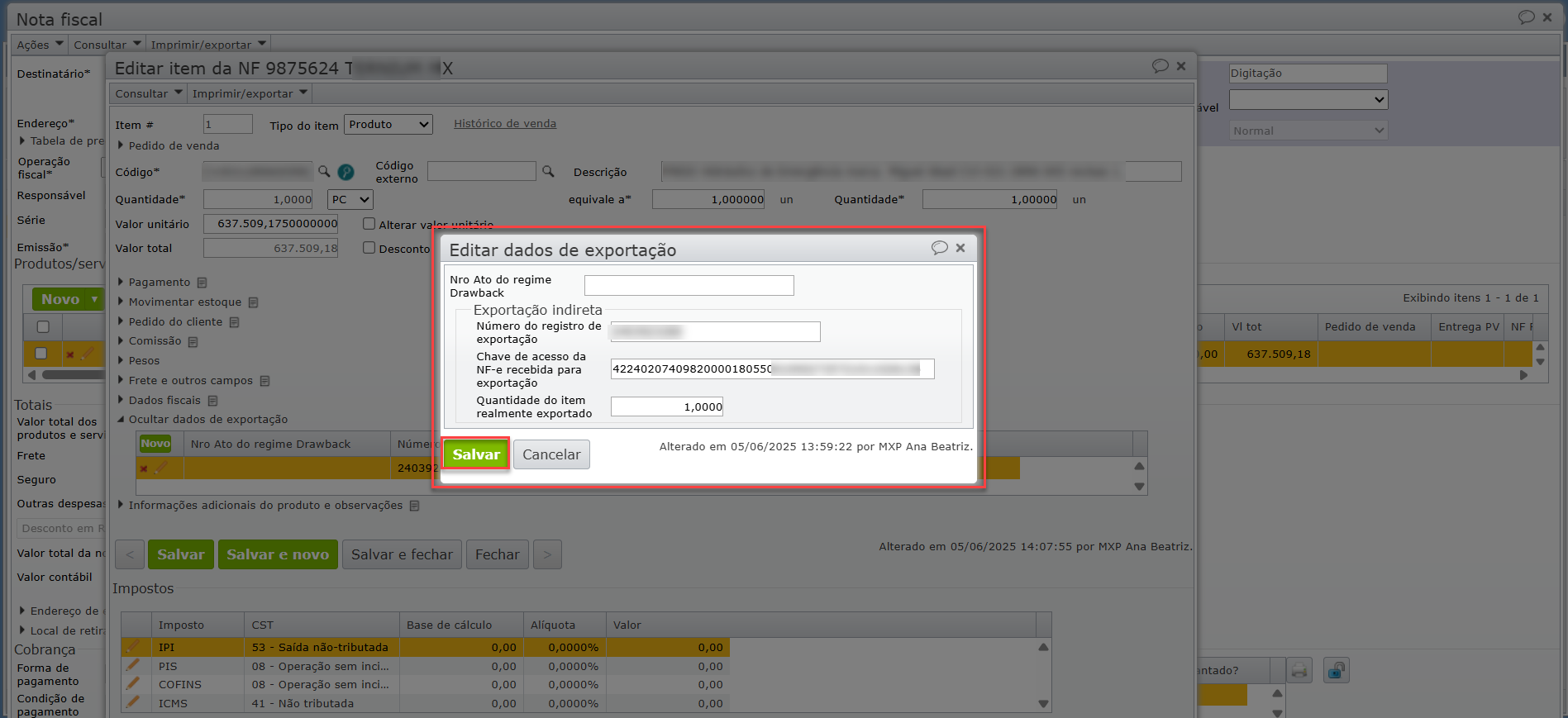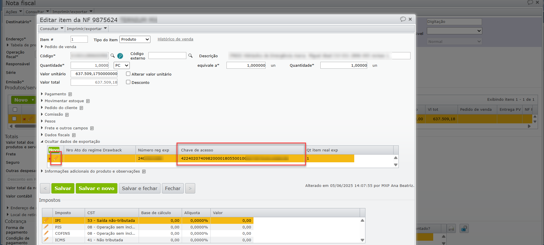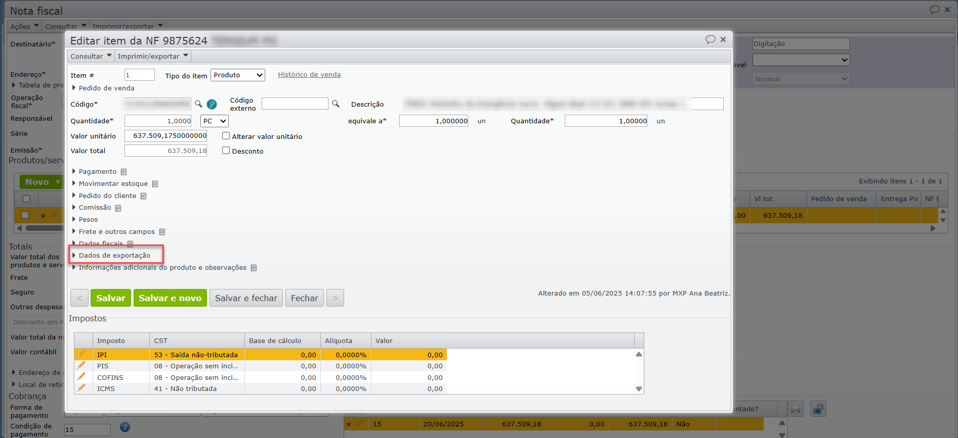4) Na edição do item da nota, clique em “Dados de exportação”.