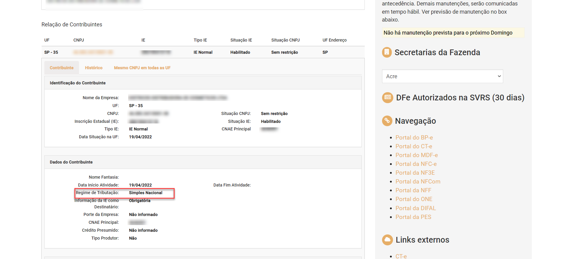 3) Será exibido o resultado abaixo, onde é possível verificar se a empresa está habilitada para emissão, e o vínculo entre CNPJ/CPF e IE. Para isso, verifique o campo “Regime de tributação”.