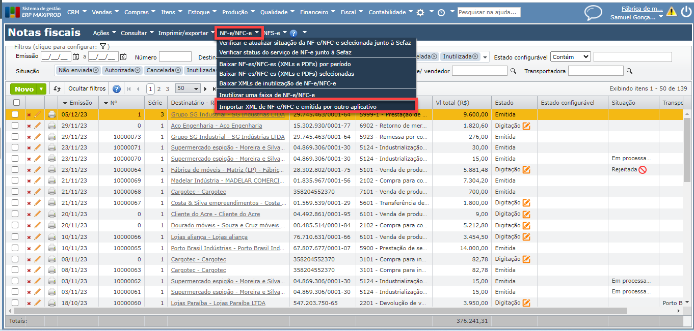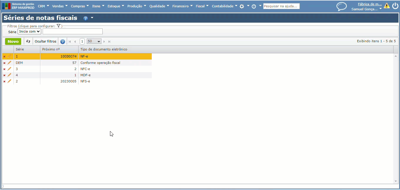 b) Não será possível importar essa nota, se existir nota com a mesma série e número no ERP MAXIPROD. Se necessário, exclua a nota atual, desde que não tenha sido transmitida para a Sefaz e caso ela tenha sido feita em duplicidade. Do contrário, siga primeiro os passos explicados mais abaixo.