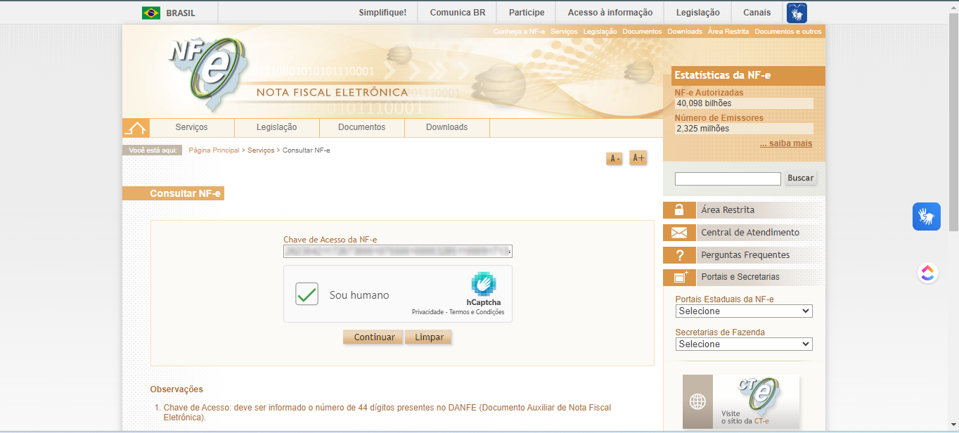 1) Acesse o site de consulta de NF-e por chave de acesso, clicando aqui. Digite a chave de acesso e faça a consulta.