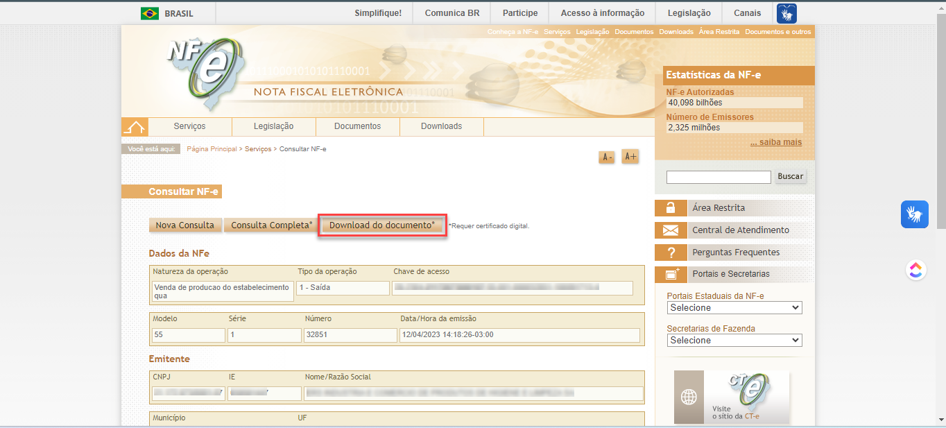 2) É possível baixar o XML da nota, se tiver o certificado digital instalado no computador. Para isso, clique no botão “Download do documento”.