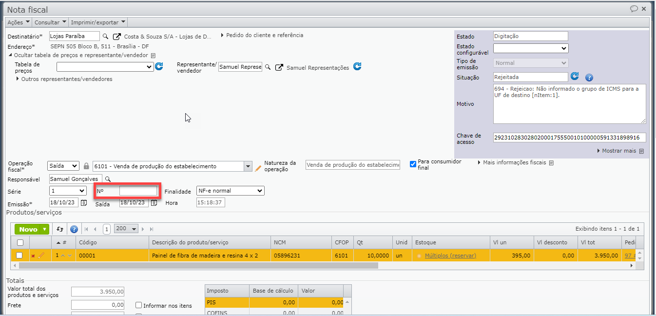 4) Para reenviar a nota que foi rejeitada, coloque outro número na NF-e. Para isso: