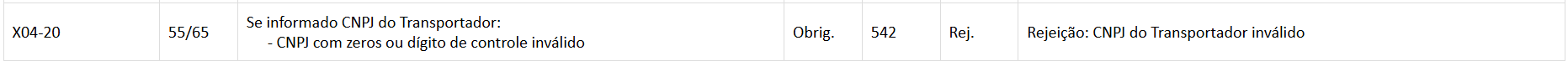Se, ao indicar uma transportadora estrangeira, a nota retornar a rejeição 542, provavelmente o campo “Documento de identificação de estrangeiro”, que recebe o número do RNM (Registro Nacional Migratório) da CRNM (Carteira de Registro Nacional Migratório) está sendo considerado como CNPJ pela Sefaz. Para evitar este problema, não preencha esse campo.