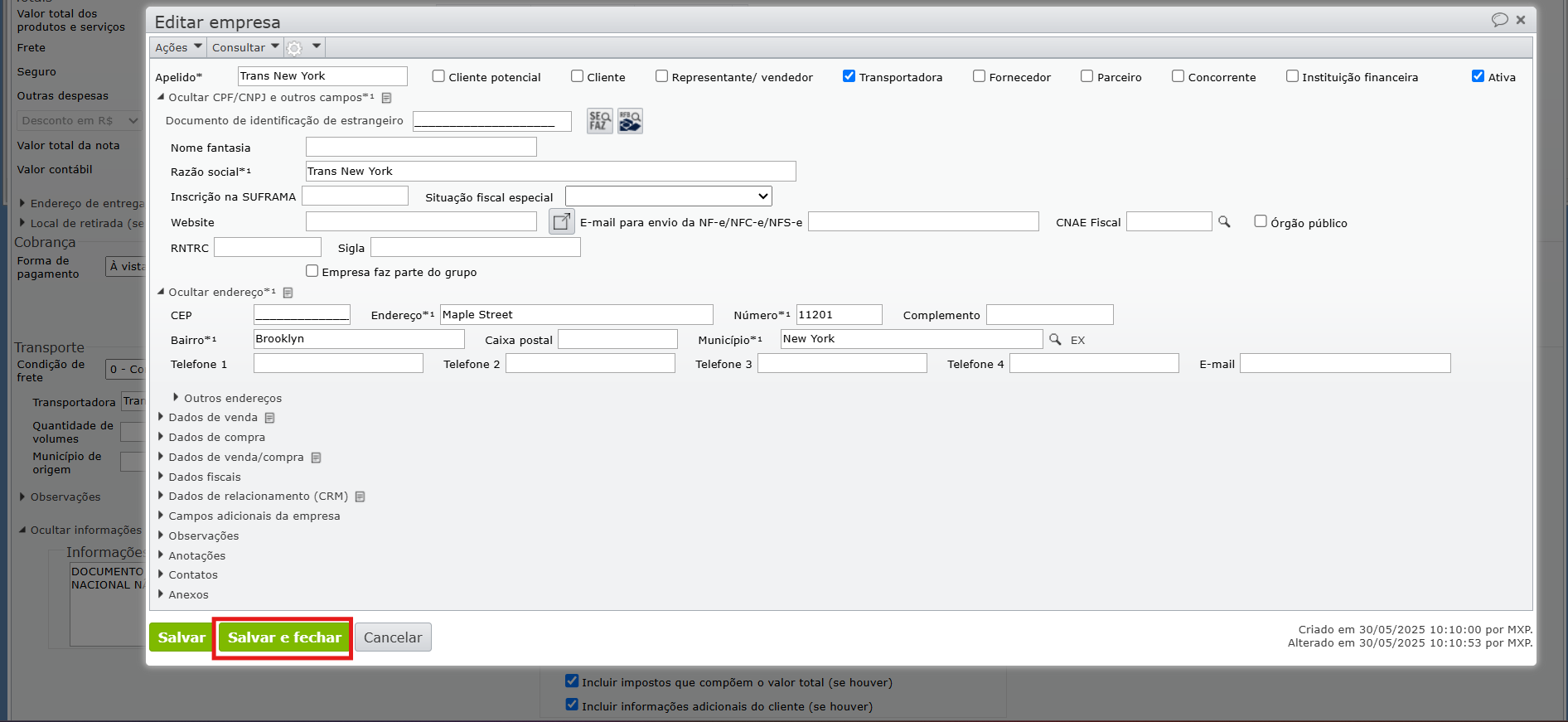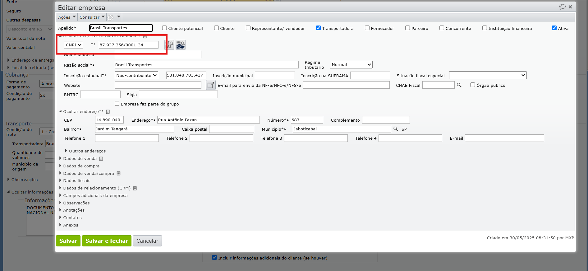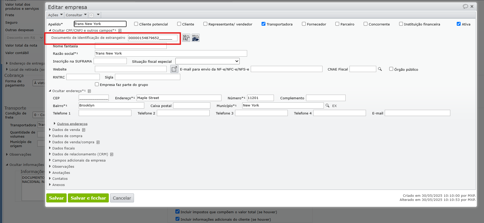 Observação: as empresas do exterior não tem CNPJ. Por isso, durante o cadastro da transportadora, ao selecionar o município estrangeiro, o campo “CPF/CNPJ” é alterado para “Documento de identificação de estrangeiro”.