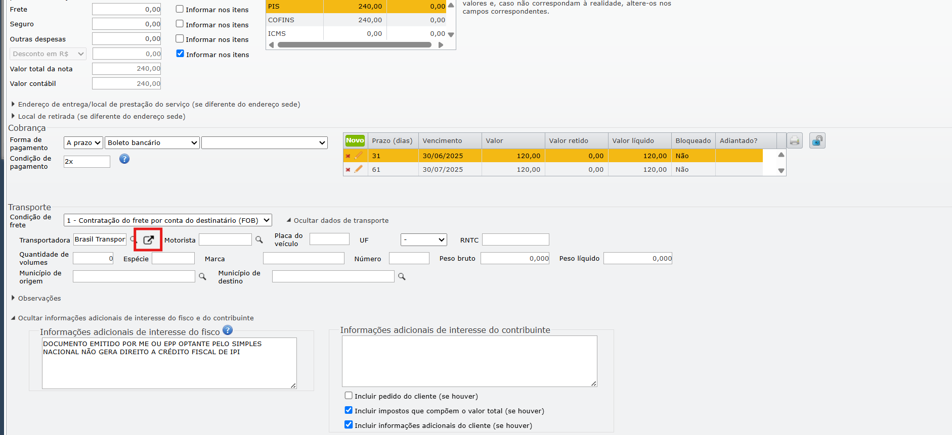 1) Na nota rejeitada, abra o cadastro da transportadora, clicando no ícone destacado na imagem abaixo.
