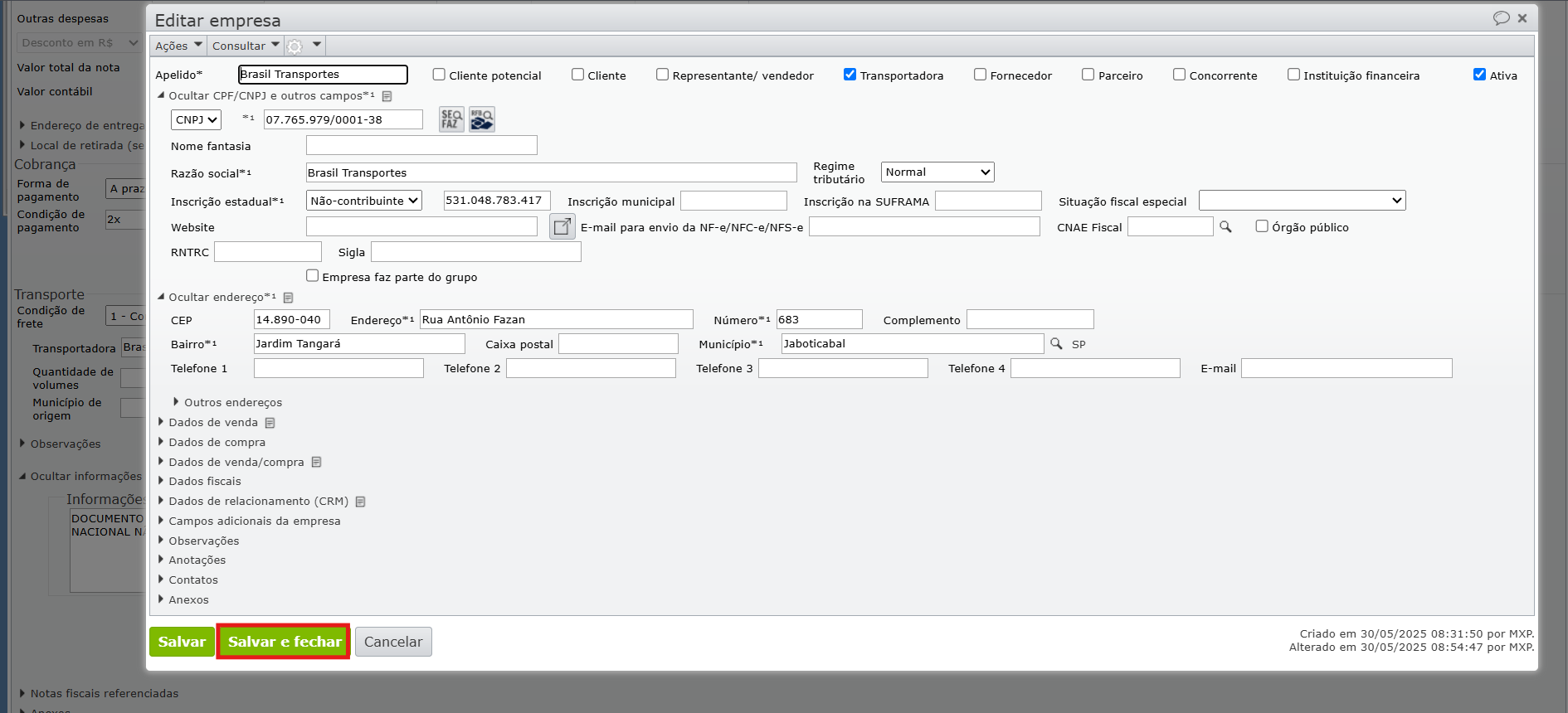 3) Clique no botão verde “Salvar e fechar” para salvar as alterações e reenvie a nota.