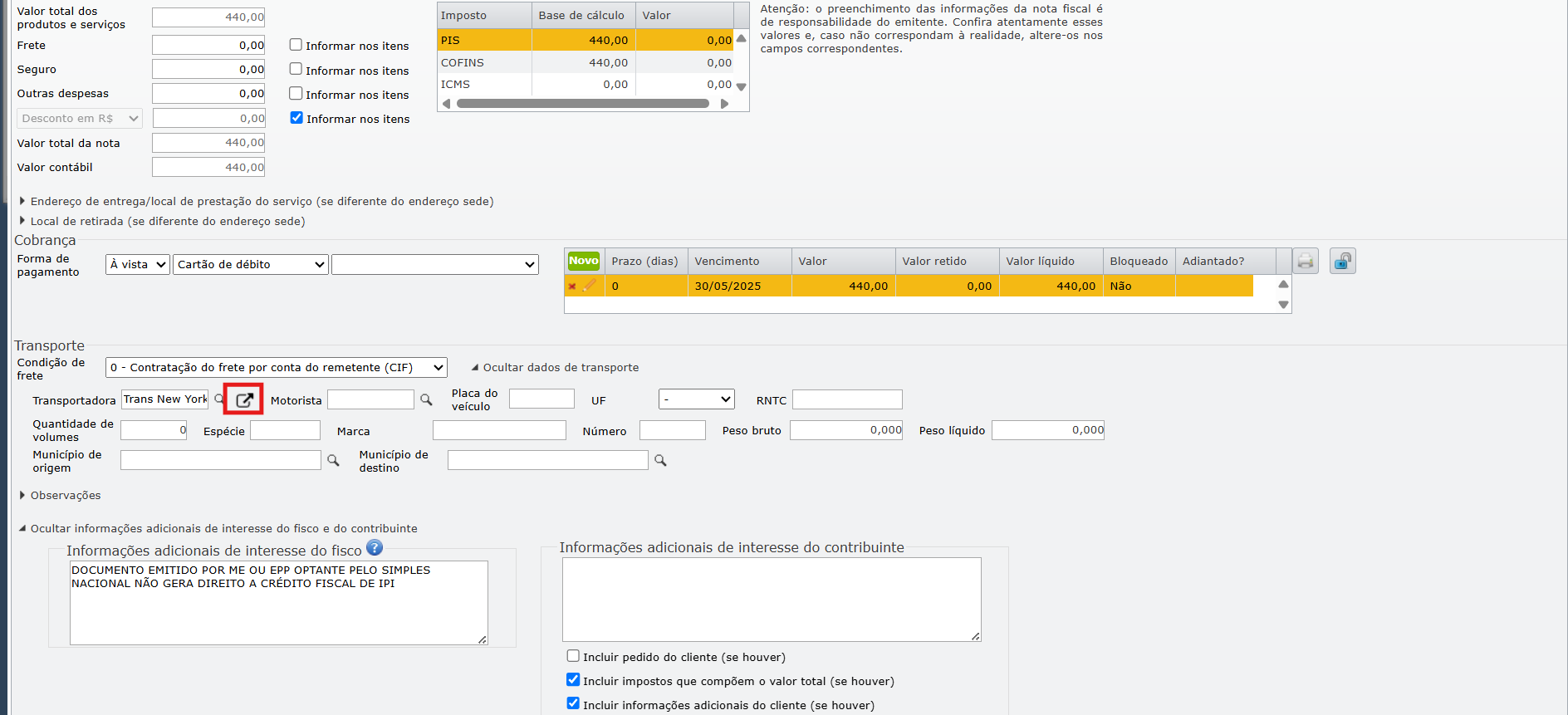 1) Na nota com a rejeição abra o cadastro da transportadora indicada clicando no ícone destacado na imagem abaixo.
