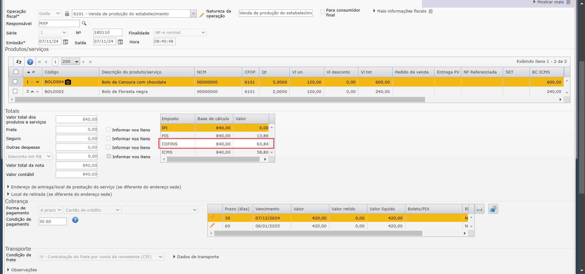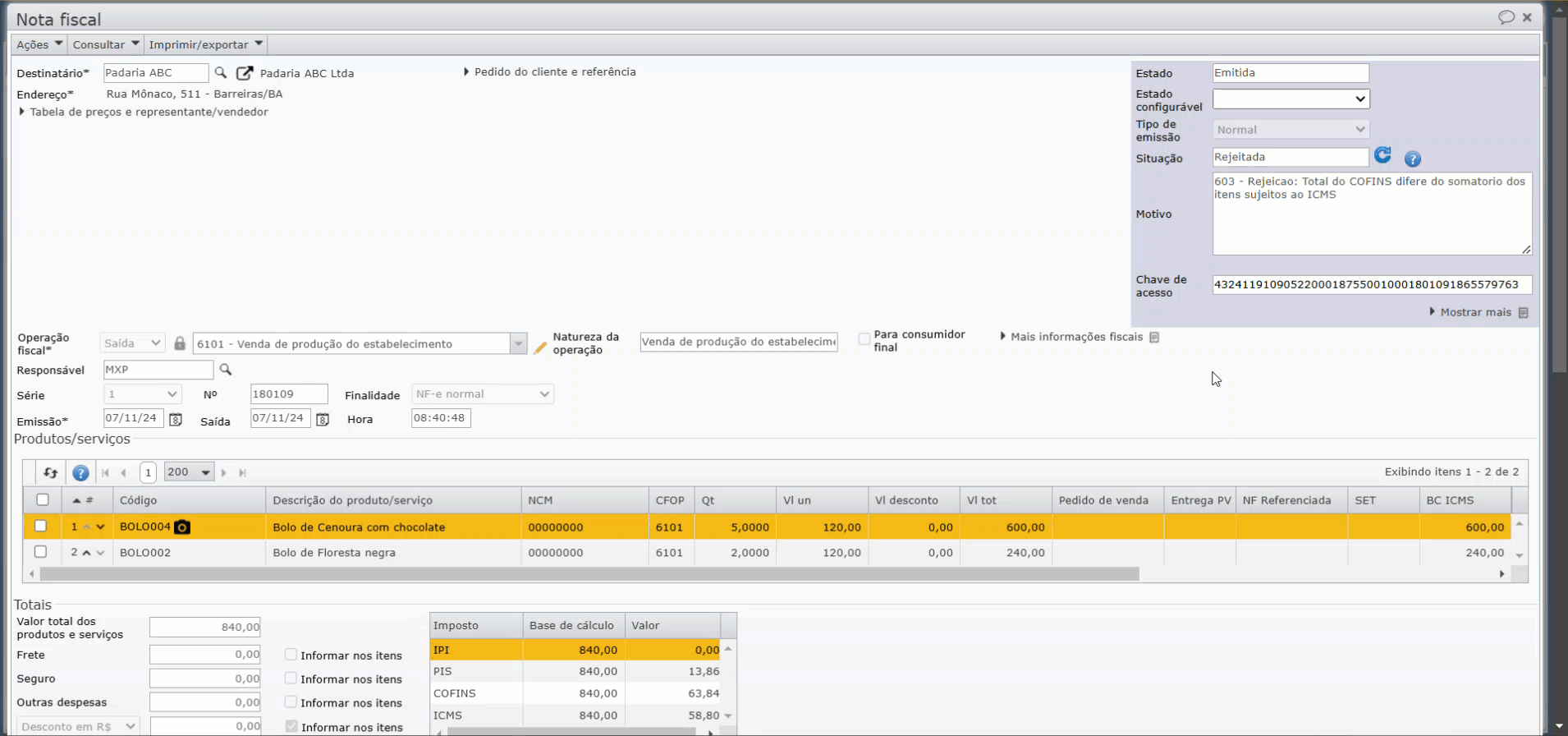 Para resolver a rejeição, é preciso corrigir o somatório do valor de COFINS. É importante sua configuração e a dos demais impostos, considerando os campos “CST”, “Base de cálculo”, “Alíquota” e “Valor”.
