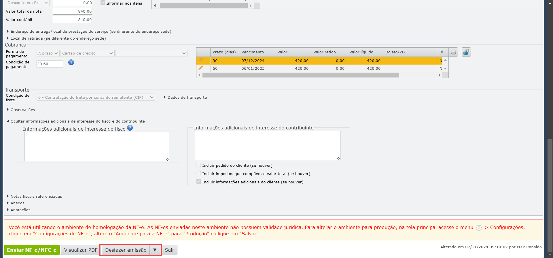 1) Na tela de edição da nota, clique em “Desfazer emissão”, para mudar o estado da nota para “Digitação”.