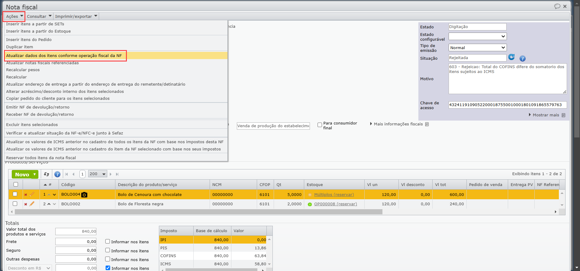 3) Se a mudança ocorreu na operação fiscal, utilize o menu “Ações > Atualizar dados dos itens conforme operação fiscal da NF“.