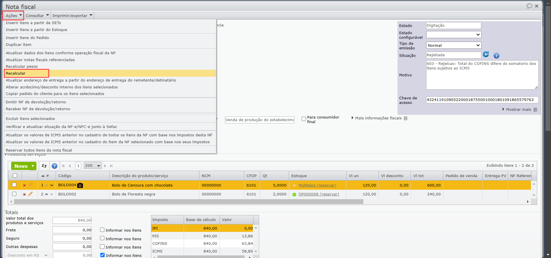 4) Se a mudança foi fora da operação fiscal, ou se nenhum campo foi alterado, o menu “Ações > Recalcular” pode ser utilizado.