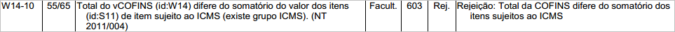 Essa rejeição ocorre quando o total da COFINS, presente nos “Totais”, não corresponde à soma dos valores do COFINS de cada item, sujeito ao ICMS da nota. Ou seja, os valores presentes na tag “vCOFINS” dos itens deve resultar no valor “vCOFINS” total da nota.