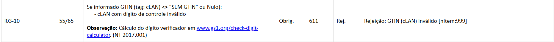 A Rejeição 611 – GTIN (cEAN) inválido ocorre quando o código de barras (tag: cEAN) informado na nota fiscal não passa na validação do dígito verificador (o último dígito do código), que é calculado com base na sequência anterior e é fundamental para a integridade do código. A rejeição é causada por erro de digitação ou preenchimento incorreto do cEAN no sistema.