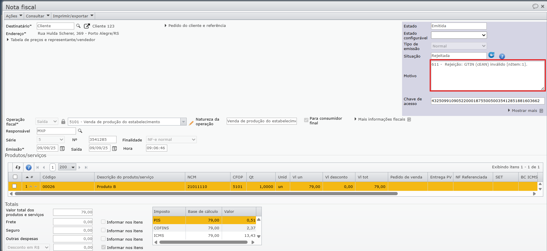 5) Após corrigir o GTIN dos itens da nota, emita novamente a NF-e, e faça o envio para a Sefaz.