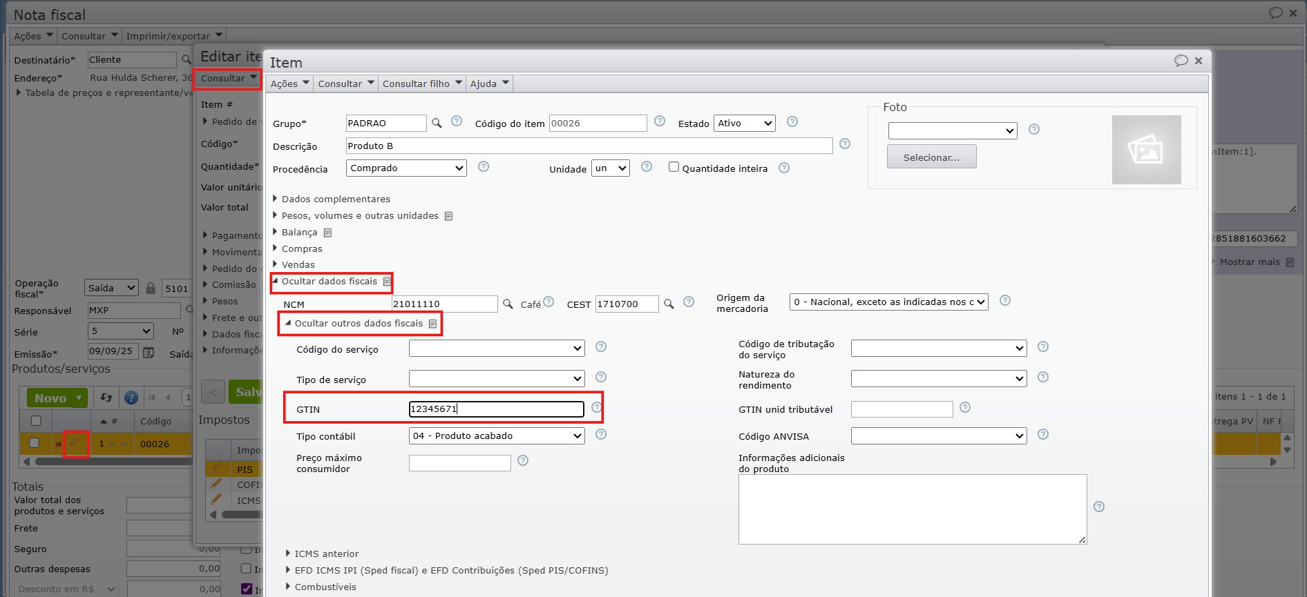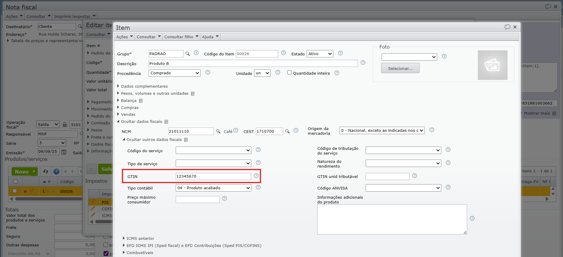 2) A seguir, desfaça a emissão da NF e edite o item. Na tela de edição do item da nota, expanda a aba “Dados fiscais > Outros dados fiscais > GTIN”, para ver o código GTIN preenchido.