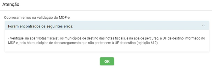 “Verifique, na aba “Documentos fiscais”, os municípios de destino das notas fiscais, e na aba de percurso, a UF de destino informado no MDF-e, pois há municípios de descarregamento que não pertencem à UF de destino (rejeição 612).”
