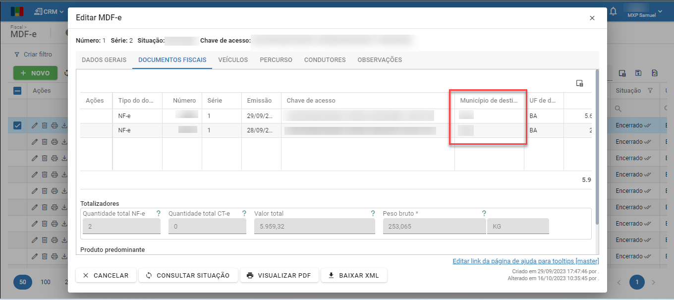 5) Acesse a aba “Documentos fiscais” e verifique os municípios presentes na coluna “Município de destino”.