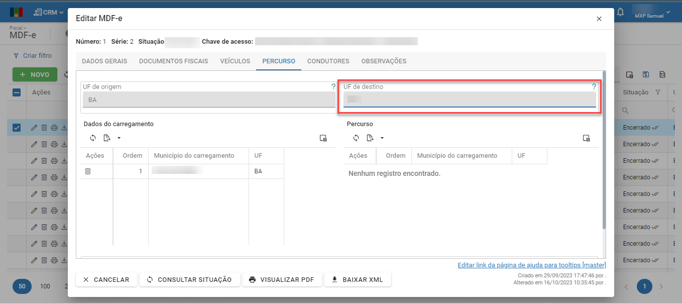 6) Acesse a aba “Percurso” e observe que a “UF de destino” não corresponde a todos os municípios de destino das NFs relacionadas no MDF-e.