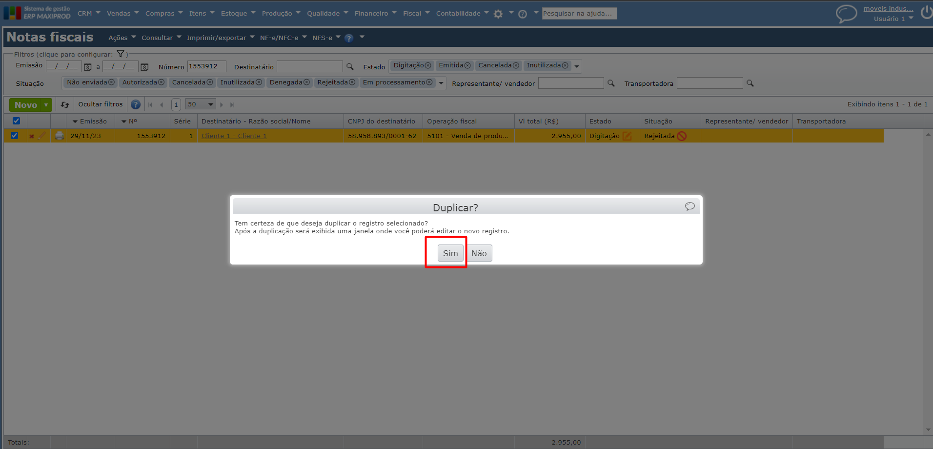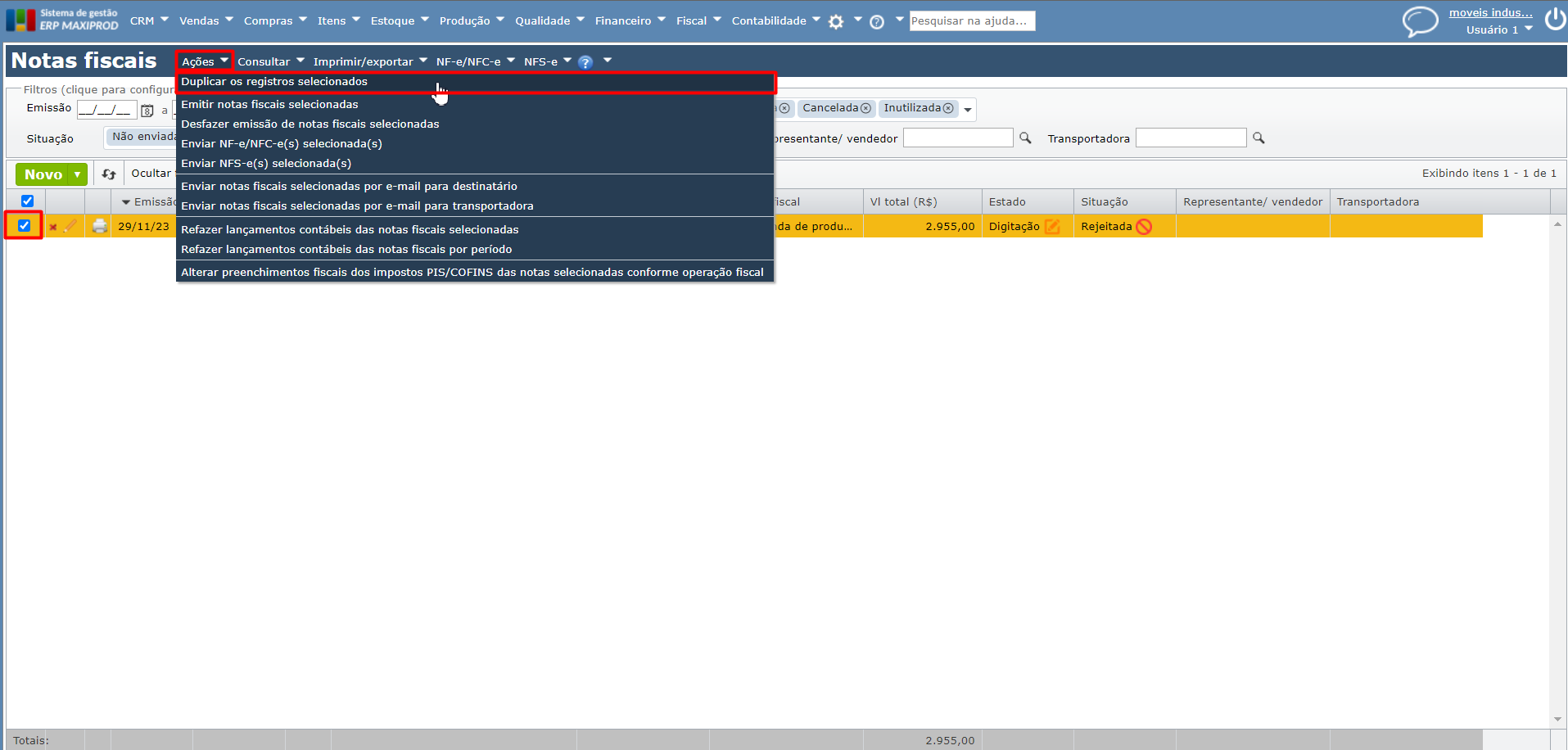 2) Procure a NF que apresentou a rejeição, selecione-a através da caixa de seleção e acesse o menu “Ações > Duplicar os registros selecionados”.