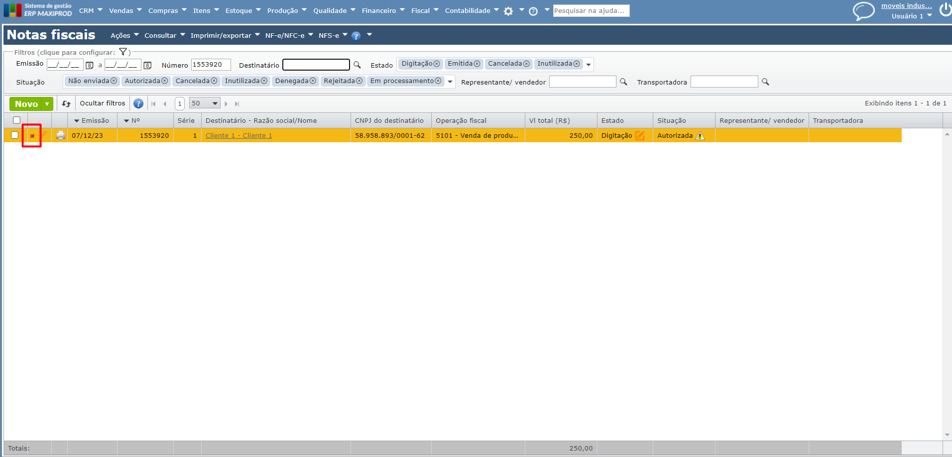 5) Finalmente, emita e envie a nova NF duplicada. Após sua autorização, desfaça a emissão da NF antiga e exclua-a do sistema, clicando no ícone “x vermelho” da grade da tela Notas fiscais.