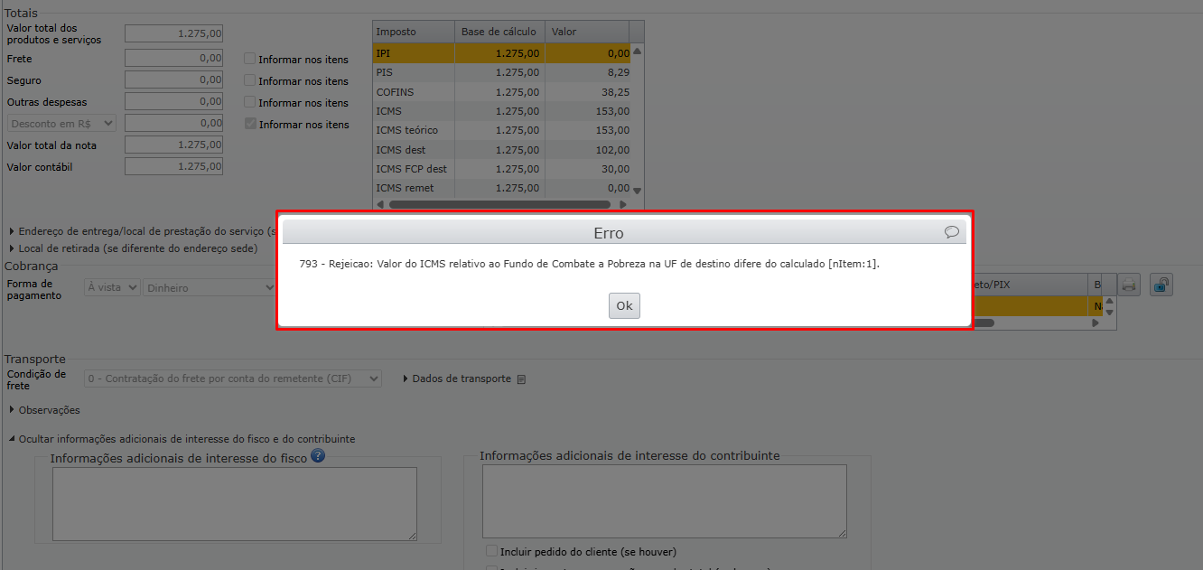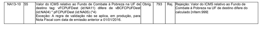 “793 – Rejeição: Valor do ICMS relativo ao Fundo de Combate a Pobreza na UF de destino difere do calculado [nItem:999]”.