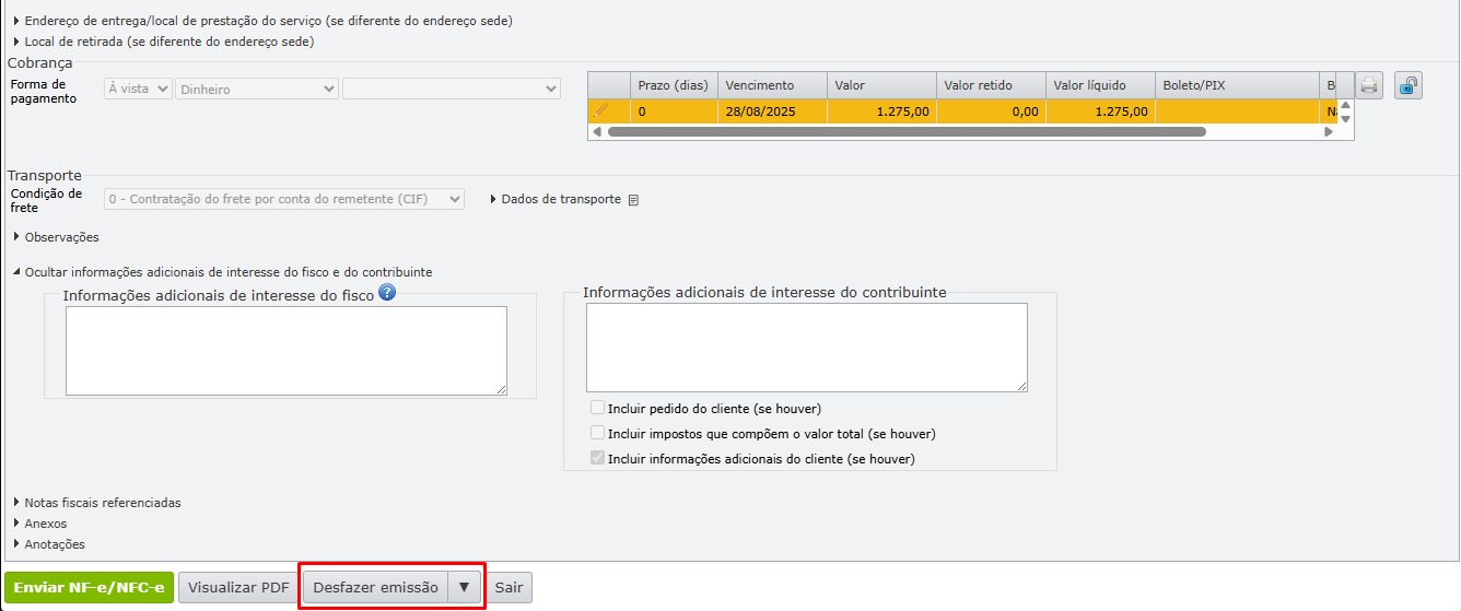 1) Ao final da nota, desfaça a emissão clicando no botão “Desfazer emissão”.