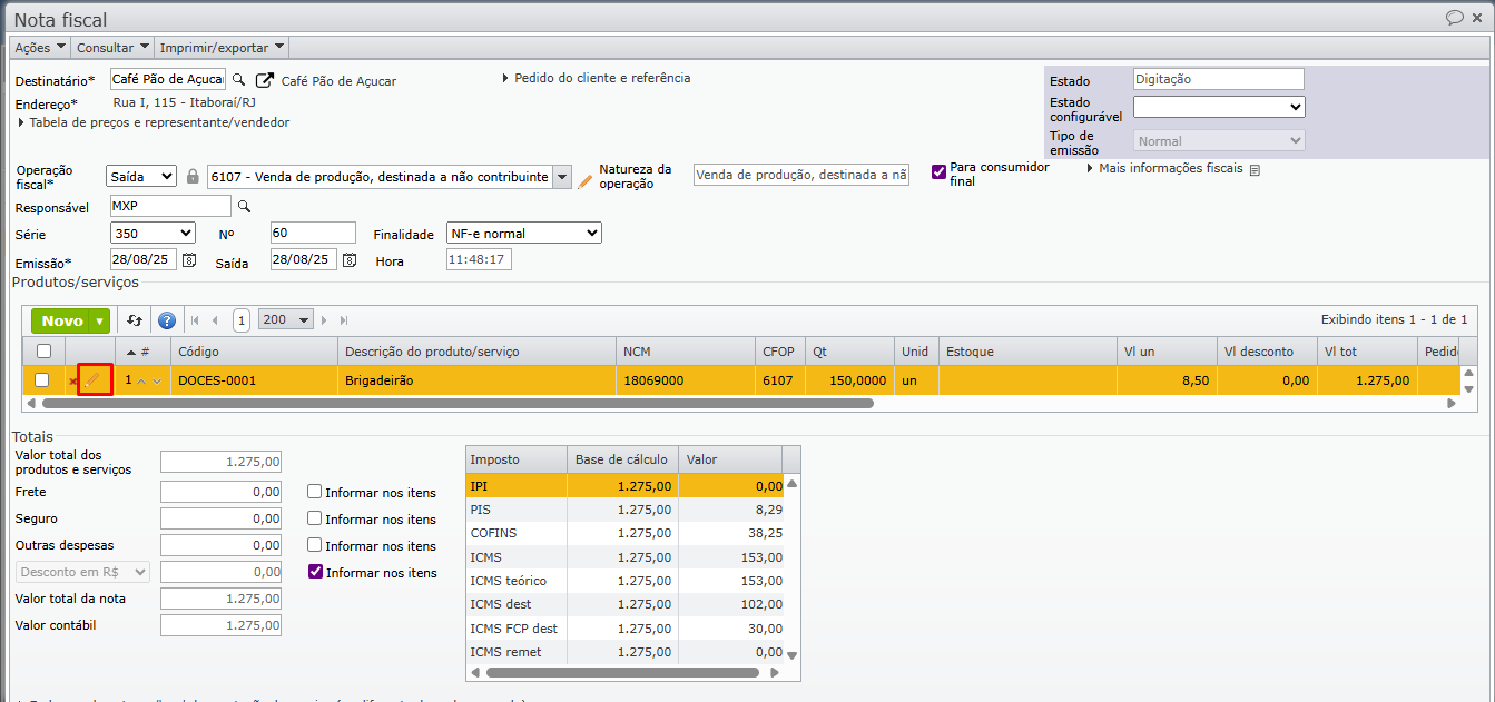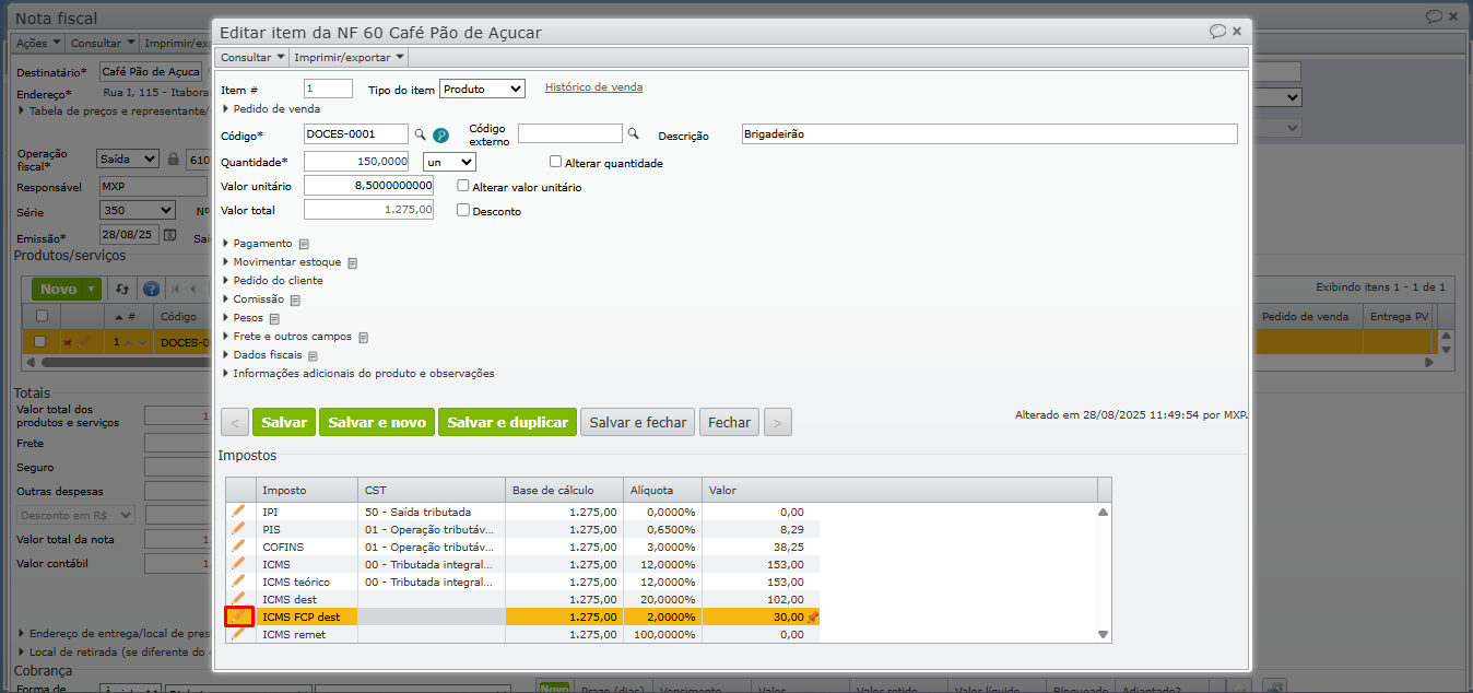 3) Na seção “Impostos” dentro do item, clique no ícone de “lápis laranja” novamente para editar o imposto ICMS FCP.