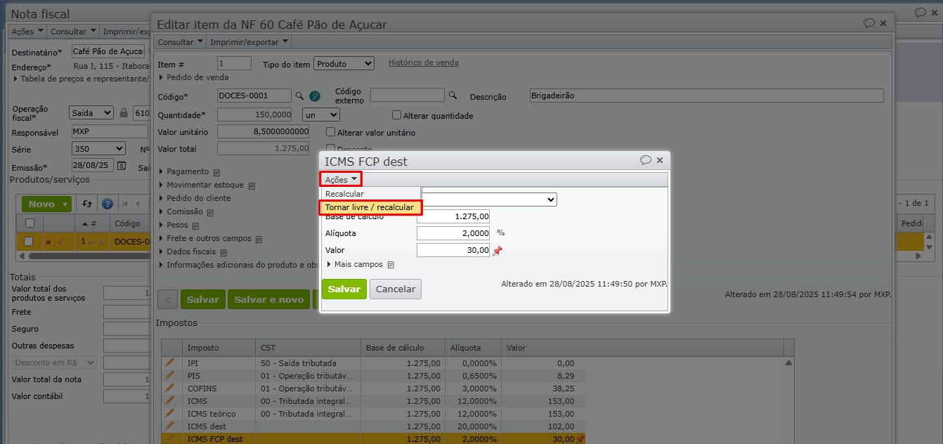 4) Na janela de edição do ICMS FCP, vá até o submenu “Ações > Tornar livre / recalcular”. Essa ação torna livre aqueles campos fixados (alterados manualmente) e faz o recálculo conforme a base e alíquota novamente.