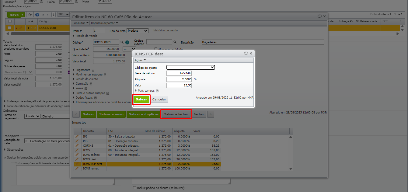 5) Após recalcular, clique em “Salvar” para salvar os valores do imposto, em seguida, clique em “Salvar e fechar”.