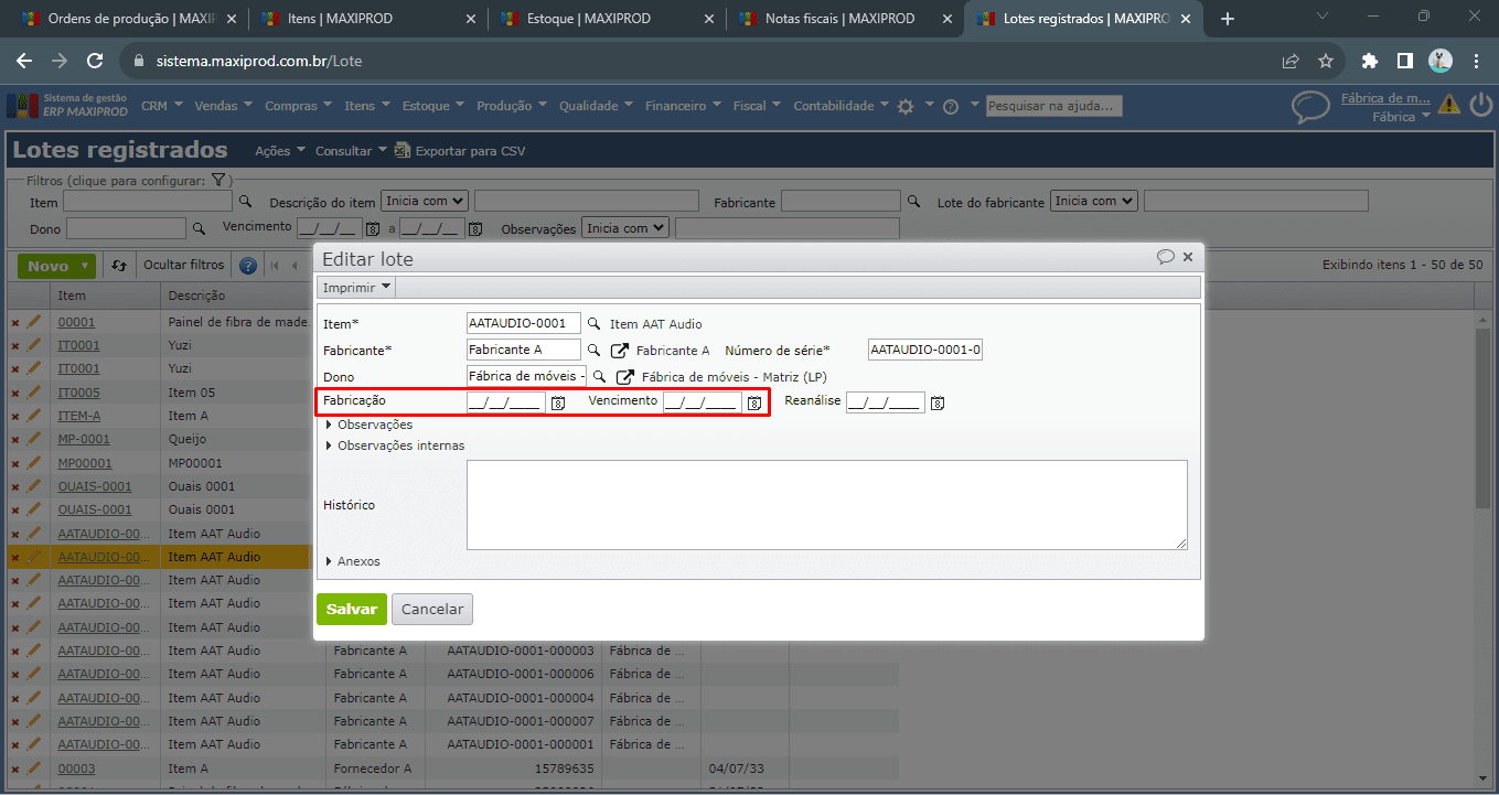 6) Para preencher a data de fabricação e a data de vencimento do lote, acesse “Estoque > Lotes registrados”, clique no botão verde “Novo” para criar um novo lote ou procure e edite o lote/número de série, preenchendo os campos “Fabricação” e “Validade”.