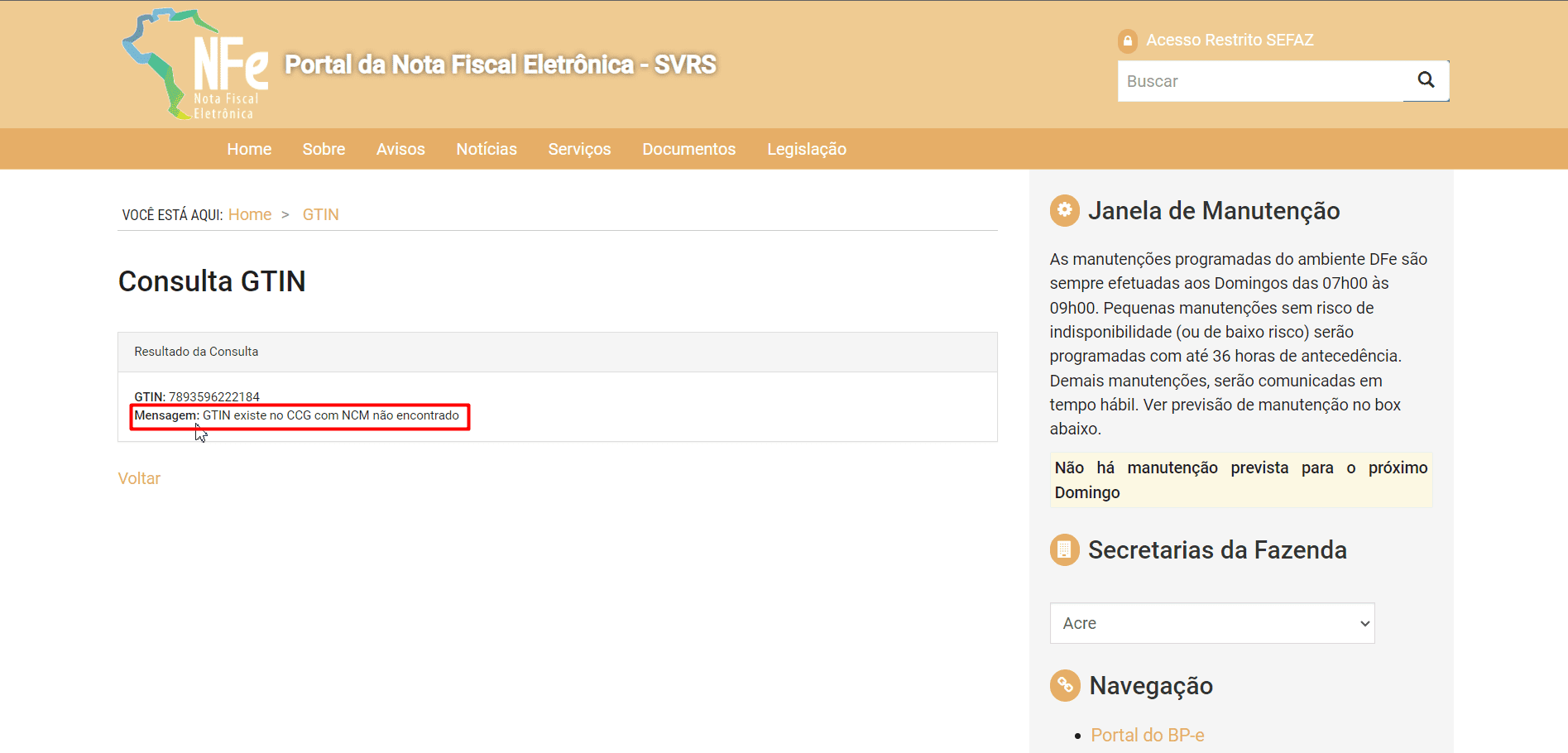 3) Se o GTIN não tem um NCM cadastrado, é exibida a mensagem “GTIN existe no CCG com NCM não encontrado“.