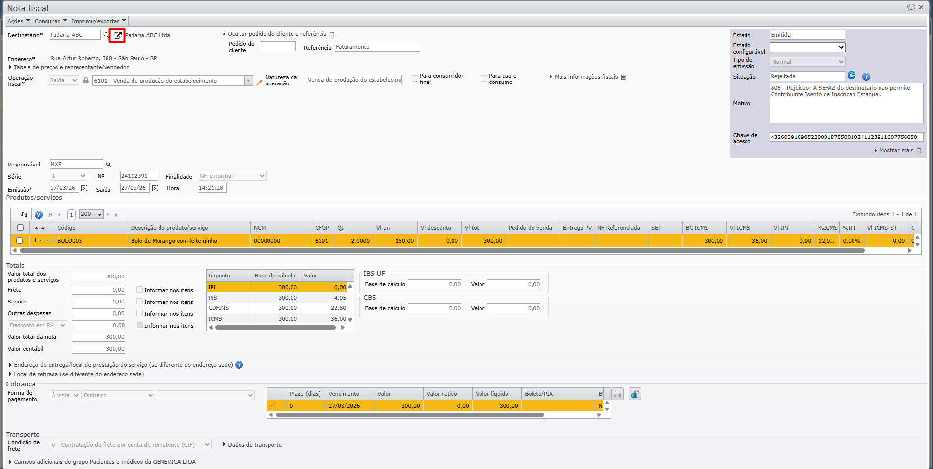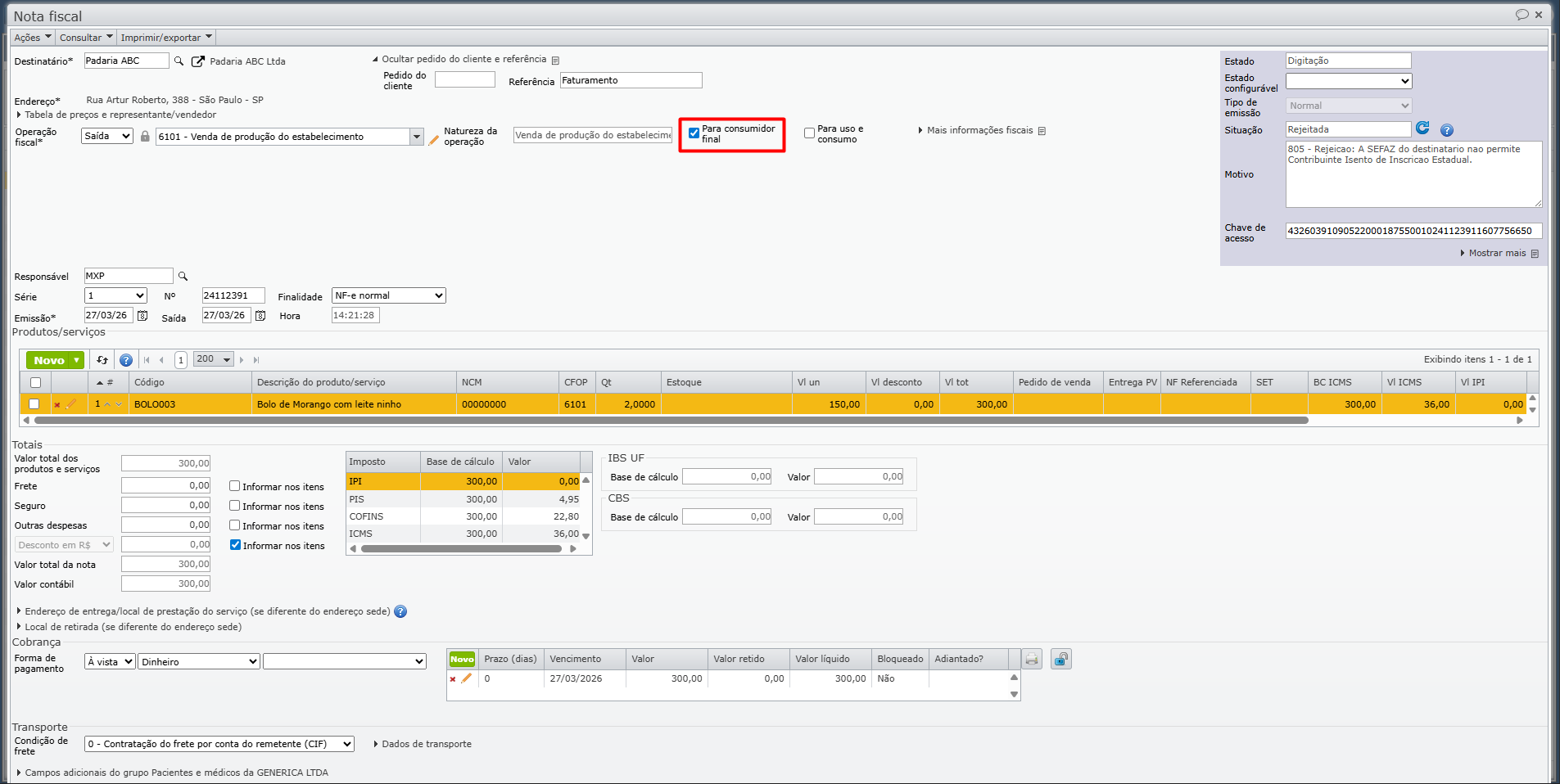 Essa rejeição significa que o cliente destinatário da nota deve ser Contribuinte, ou seja, possui uma inscrição estadual, ou Não-contribuinte e, portanto, a venda será para consumidor final.
