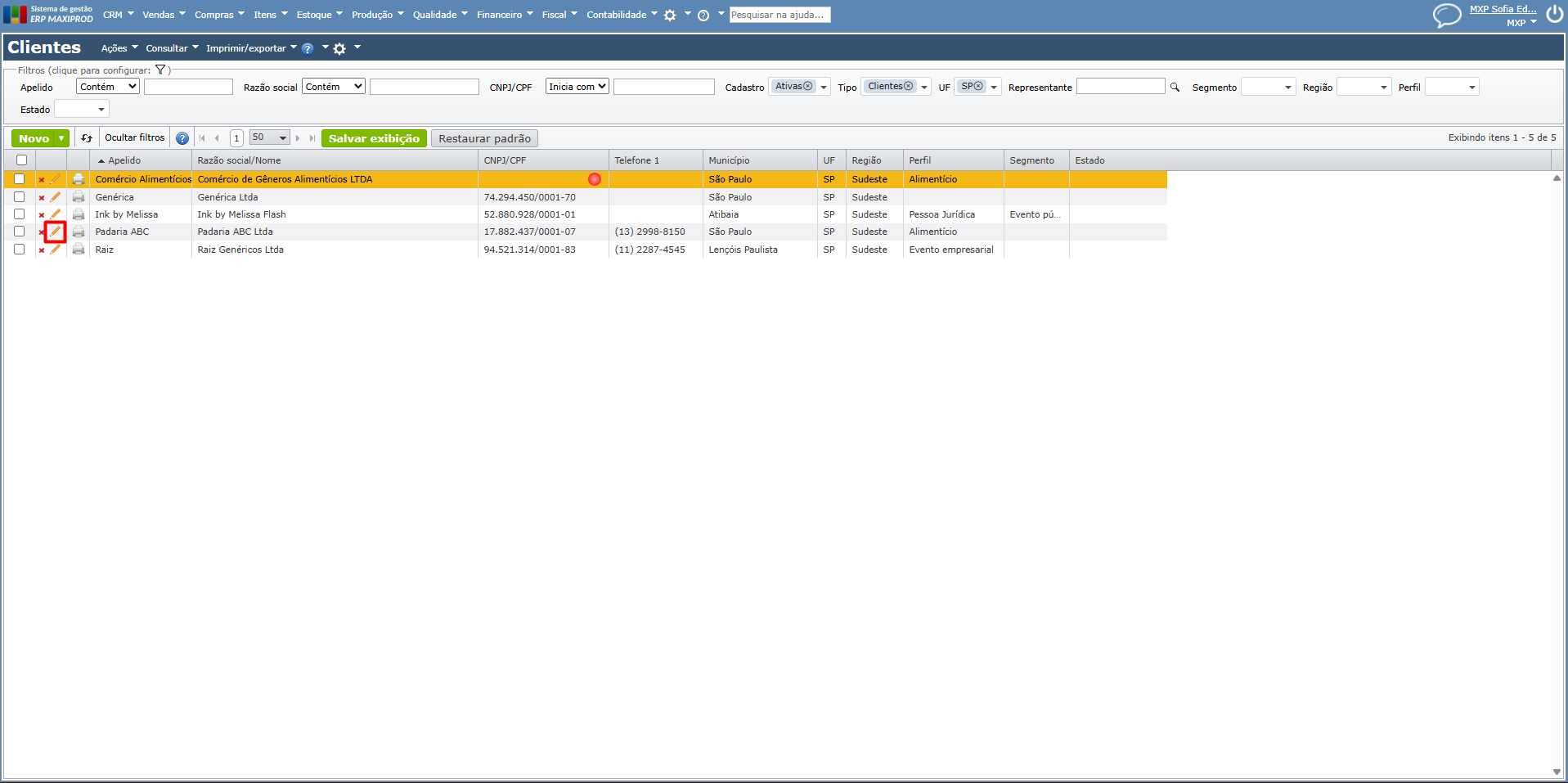 2) Ou então, acessando “Vendas > Clientes” ou qualquer outra tela de cadastro de empresas, localize o cadastro do destinatário e clique no “ícone de lápis”.