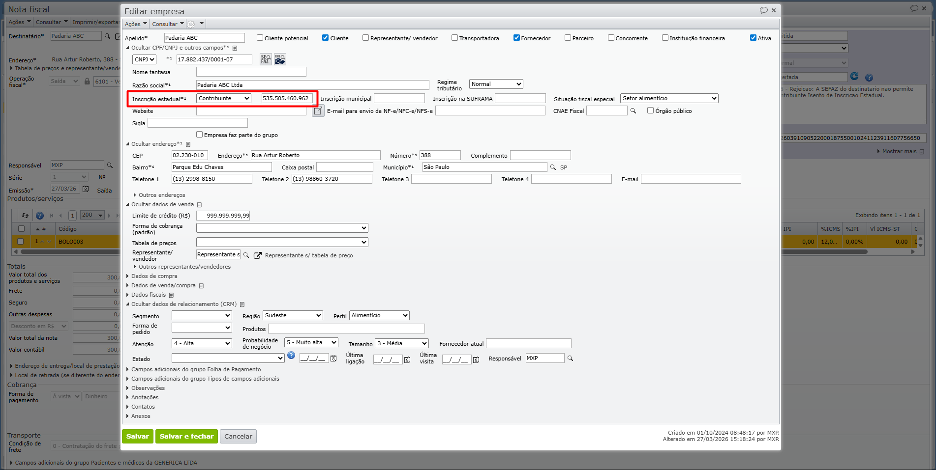 3) Altere o campo “Inscrição estadual” para “Contribuinte” e informe a inscrição do cliente no campo ao lado.