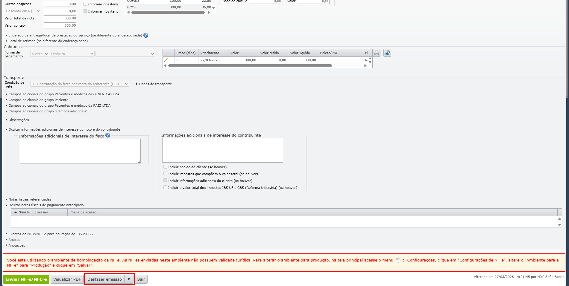 6) Na edição da nota fiscal, clique em “Desfazer emissão”. Para saber mais sobre a ação de desfazer emissão, clique aqui.
