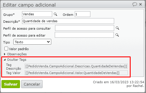 • Desenvolvida criação de tags personalizados com base nos grupos e campos adicionais dos pedidos de venda. Para saber mais sobre relatórios e campos adicionais dos pedidos de venda, clique aqui.