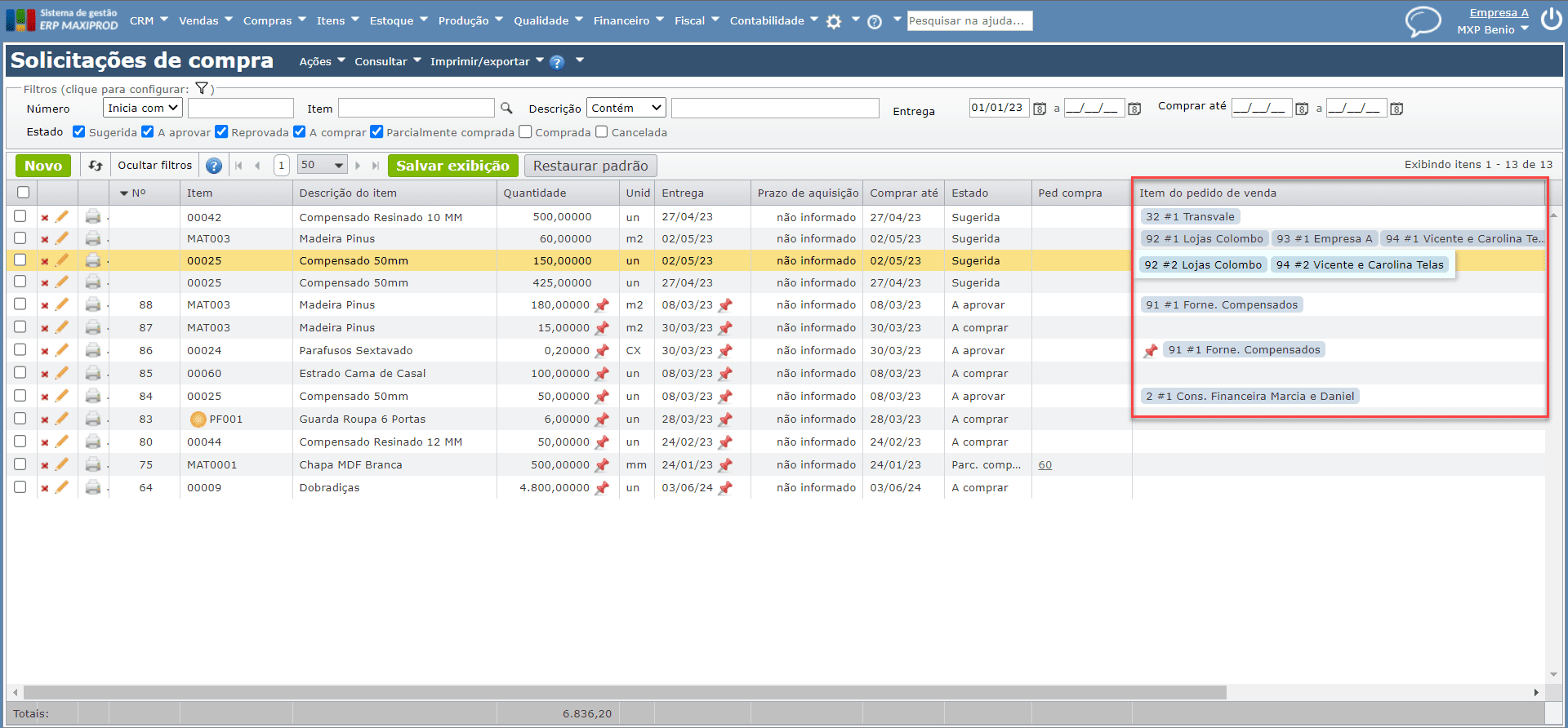 • Melhoria realizada na tela de Solicitações de compra, facilitando a visualização dos vínculos das solicitações com Pedidos de venda. Para saber mais sobre Solicitações de compra, clique aqui.