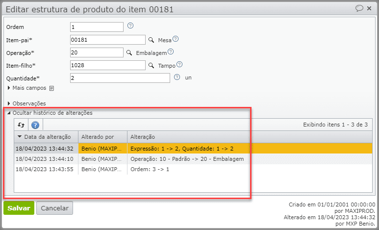 • Desenvolvida possiblidade de visualizar o histórico de alterações realizadas na tela de Estrutura de produto.